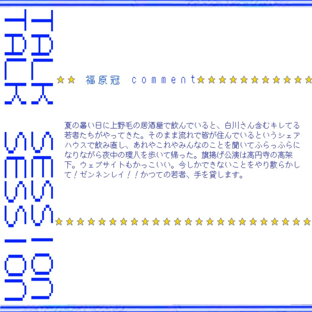 夏の暑い日に上野毛の居酒屋で飲んでいると、白川さん含むキレてる若者たちがやってきた。そのまま流れで皆が住んでいるというシェアハウスで飲み直し、あれやこれやみんなのことを聞いてふらっふらになりながら夜中の環八を歩いて帰った。旗揚げ公演は高円寺の高架下。ウェブサイトもかっこいい。今しかできないことをやり散らかして!ゼンネンレイ!!かつての若者、手を貸します。